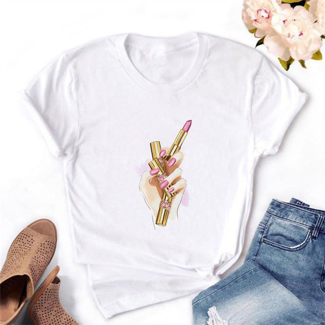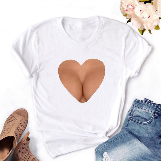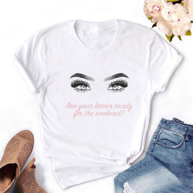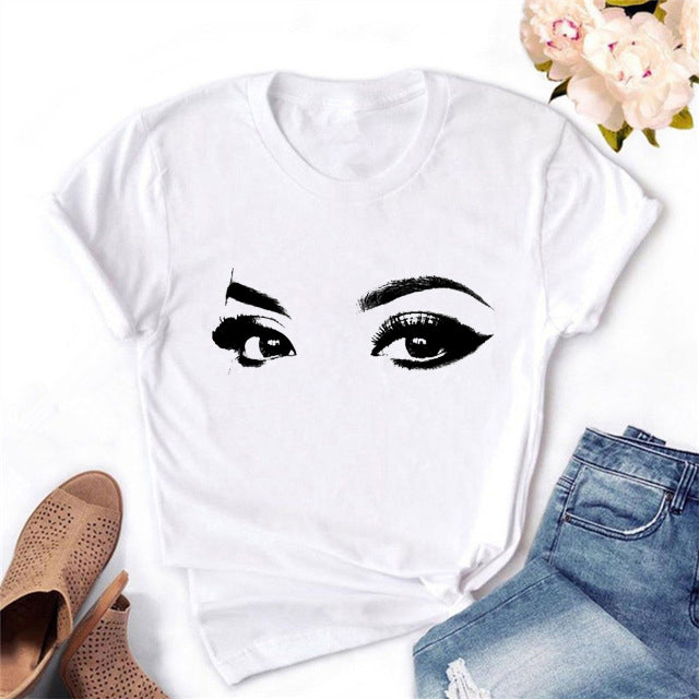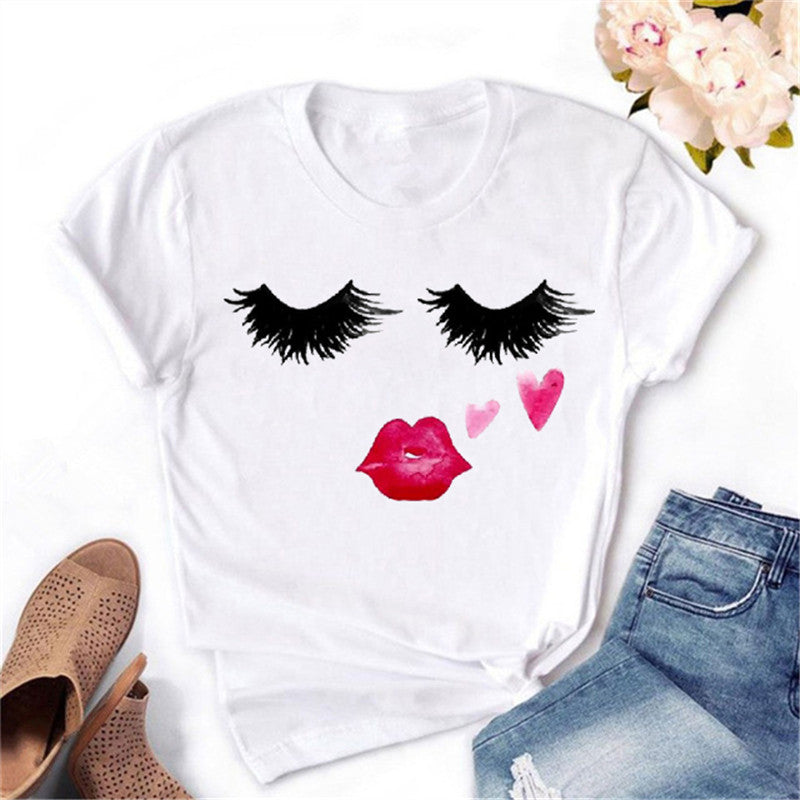 2020 Women T-shirt Eye Lashes Red Lips HEART Print Top Female Tshirt Fashion Casual Sleeve O Neck BASIC White Ladies Clothes